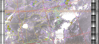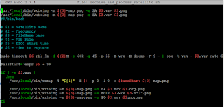 Although wxtoimg can produce multiple decoded images from the downloaded data the Instructables project only used one of them. K2QA and I played around with the Windows version of the program and its output and figured out a couple of additional command line options that can be added to produce additional images. They’re shown in the script in Figure 1below, which is in the /home/pi/weather/predict folder. These produce the images in Figure 2, Figure 3and Figure 4below.