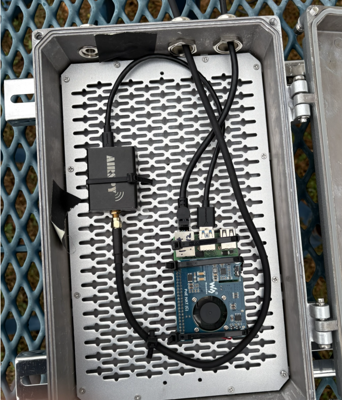 The Airspy R2 is connected to a Raspberry Pi 4 running SpyServer software. Both the Pi and SDR are mounted in a watertight enclosure on the pole, with a Power over Ethernet (PoE) adapter enabling a single Ethernet cable run from inside the clubhouse. This cable provides power to the Pi, SDR, and the preamp on the feed, while also delivering network connectivity.