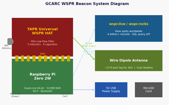 The GCARC WSPR Network is a club-wide collaborative project in which members build, deploy, and operate their own WSPR (Weak Signal Propagation Reporter) beacons from their home stations. Each member builds a low-cost, self-contained beacon using a TAPR Universal WSPR HAT kit and a Raspberry Pi Zero 2W. Once on the air, beacons transmit automatically 24/7, uploading propagation spot data to public databases that the entire club can then analyze together.