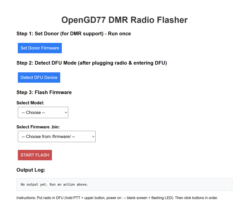 To solve this, we built a dedicated Raspberry Pi Zero W as a standalone, web-based flasher appliance. Linux handles raw USB DFU access natively through libusb—no drivers, no signature enforcement, no permission fights. The Pi boots, joins the clubhouse Wi-Fi and runs a minimal Flask server hosting a simple browser interface at http://dmr-flasher.local:5000 or an IP address assigned at the clubhouse. Any phone, tablet, or laptop on the network can access it without installing anything. Hook the radio’s programming cable up to the Pi, bring up the web interface, select the radio type and driver and it will upload the new firmware to the radio for you. (Thanks to Grok AI for the code, as usual…)
