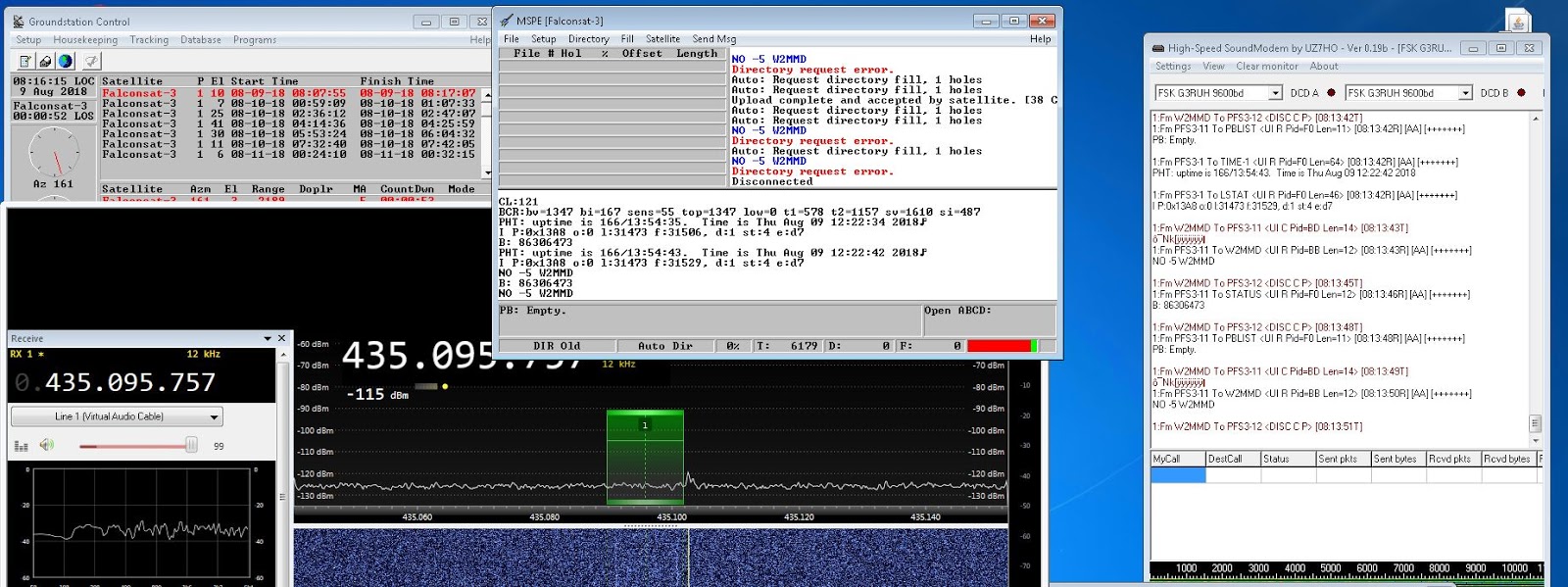 8/2/18 – looks like possible success! I tried running WISP on a recorded SDR track – it listed the files that it had downloaded and tried to transmit to get the fills (the 847 was off so it didn’t really transmit, but it did key the VOX on the RigBlaster). So maybe it will actually work. I set the programs up to track the FalconSat passes overnight and tomorrow AM, so we’ll see if it actually gets the data. Here’s how it looks: