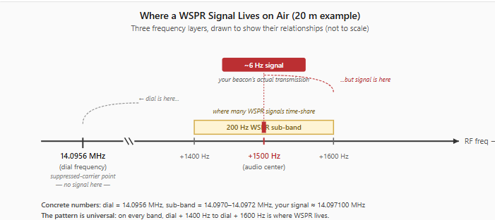 “Tune your SDR 1500 Hz above the WSPR dial frequency. The dial is the SSB suppressed-carrier point — a mathematical reference, not where the signal actually lives. WSJT-X places its tones at 1500 Hz audio, and the SSB transmitter translates that to (dial + 1500 Hz) on air. Your beacon is doing exactly the same thing. Look at 14.097100 MHz, not 14.0956 MHz.”